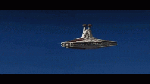 A detailed view of a Star Wars Venator-class Star Destroyer, associated with CT Rain and the 104th, against a blue sky.