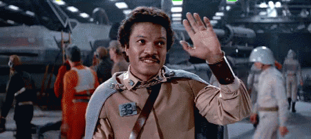 Lando Calrissian (Billy Dee Williams) waves and offers a 'Good luck' greeting in a Star Wars scene.