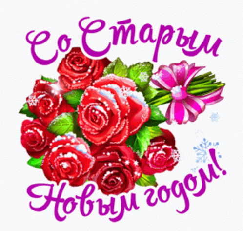 A vibrant bouquet of red roses with a pink bow, wishing 'Happy Old New Year!' in Russian.