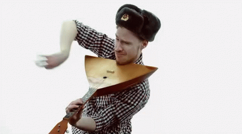 Stas Davidov, wearing a Russian ushanka, enthusiastically plays a balalaika.