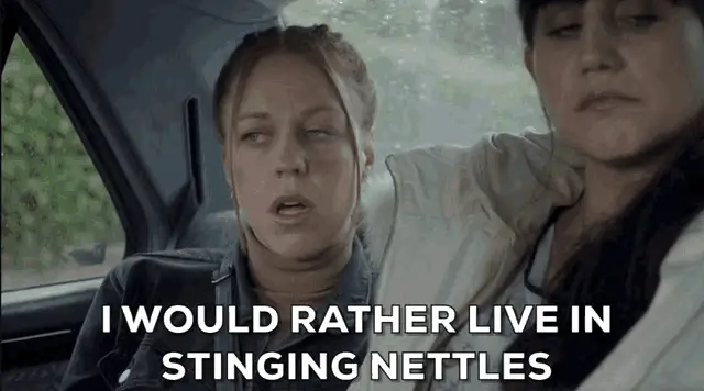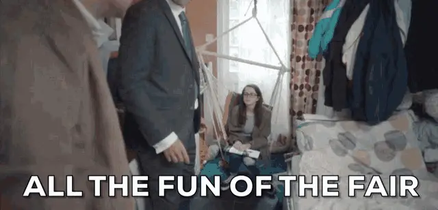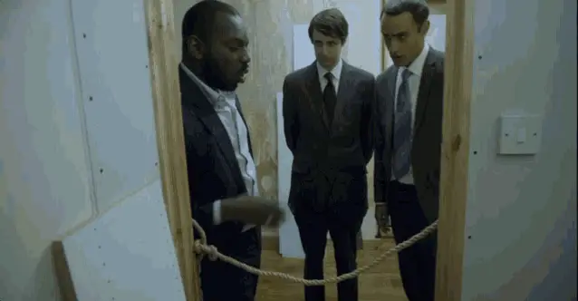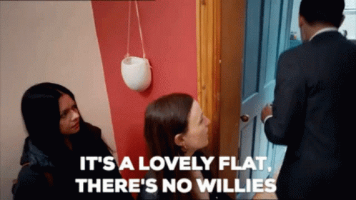Stath (Jamie Demetriou) shows a flat, declaring it's lovely with 'no willies' to two women.