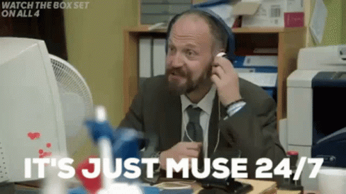 Jamie Demetriou as Stath, wearing headphones, exclaims about listening to 'Loud Muse 24/7' in an office.
