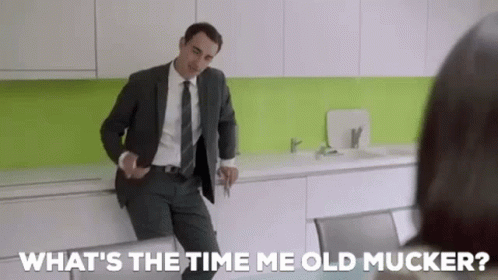Jamie Demetriou as Stath asks 'What's the time me old mucker?' in a kitchen scene from Stath Lets Flats.