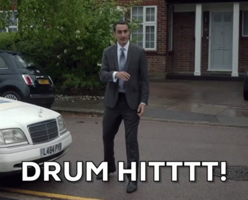 Jamie Demetriou as Stath in a suit, doing a 'Drum Hit' dance move on the street.