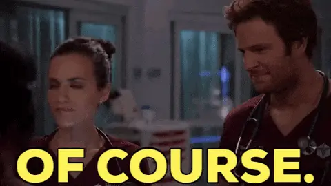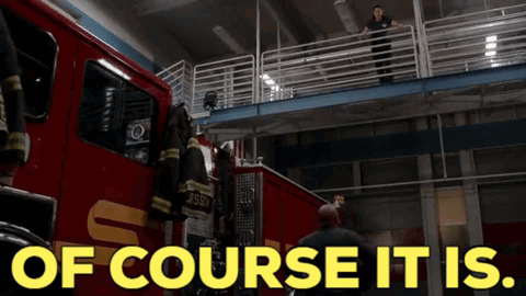 Andy Herrera from Station 19 stands on a balcony above a fire truck, with the caption 'Of course it is.'
