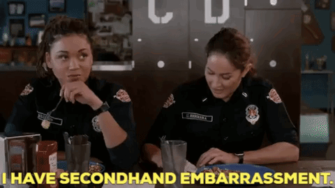 Andy Herrera from Station 19 experiences secondhand embarrassment while sitting at a table with a colleague.
