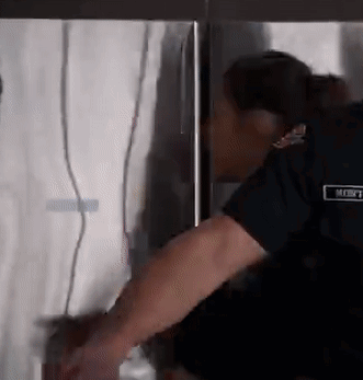 Andy Herrera, played by Jaina Lee Ortiz from Station 19, opens and looks inside a refrigerator.