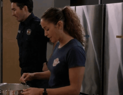 Andy Herrera from Station 19 tastes food from a pot in the kitchen, seemingly enjoying the delicious meal.