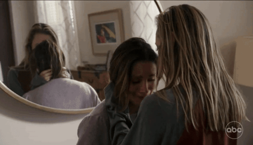 Maya Bishop and Carina DeLuca share a comforting hug in Station 19, reflecting in a mirror.