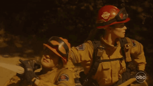 two firefighters carrying a hose with abc written on the bottom right