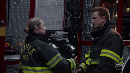 two firefighters are standing in front of a fire truck with the abc logo on the bottom
