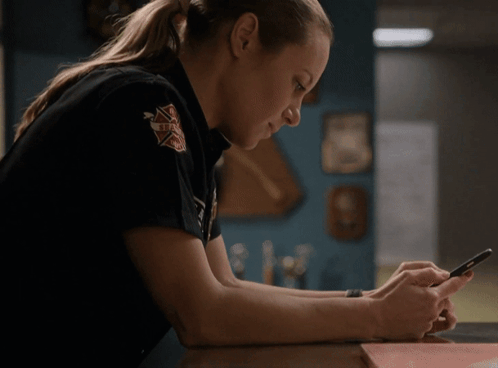 Station 19's Maya Bishop, played by Danielle Savre, is seen in her firefighter uniform, intently checking her mobile phone.