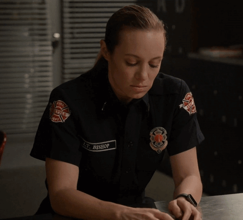 Station 19's Maya Bishop, also known as Lt. Bishop, sits at a desk and checks her cell phone.