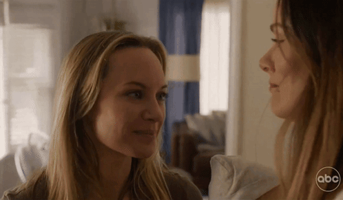 two women are looking at each other in a living room with abc written on the bottom of the picture .