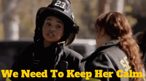 Station 19's Andy Herrera, played by Jaina Lee Ortiz, looks up as a caption reads 'We Need To Keep Her Calm'.