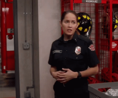 Andy Herrera (Jaina Lee Ortiz) from Station19 displays a confused expression in the fire station locker room.