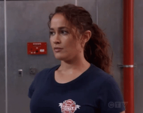 Andy Herrera from Station 19 takes deep breaths, wearing her Seattle Fire Department uniform.