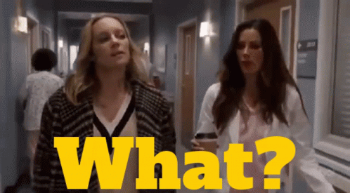 Carina Deluca and another woman walk in a hospital, reacting with a confused 'What?'