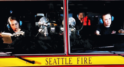 Station19 actresses Jaina Lee Ortiz, Danielle Savre, and Barrett Doss in a Seattle Fire truck.