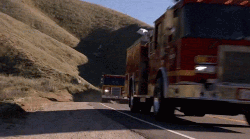 Two Station19 fire trucks drive along a winding mountain road under a clear sky, showcasing their journey.