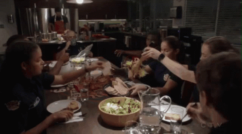 Station19 firefighters enjoying a communal dinner feast together at a long table, with credits for Stacy McKee.