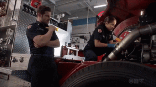 Andy Herrera and Jack Gibson from Station19 work on repairing a fire truck in the garage.