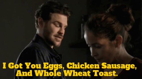 Jack Gibson from Station19 prepares eggs, chicken sausage, and whole wheat toast for someone in the kitchen.