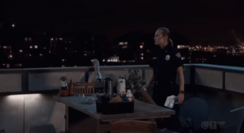 Maya Bishop, in her police uniform, angrily slams and throws a tray on a rooftop balcony at night.