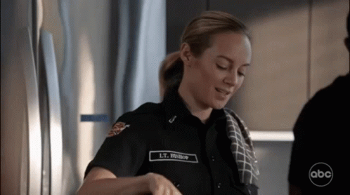 Station 19's Maya Bishop (Danielle Savre) in her uniform, smiling in the kitchen, possibly cooking.