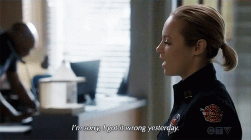 Maya Bishop in her Station 19 firefighter uniform, sincerely apologizing for a mistake made yesterday.