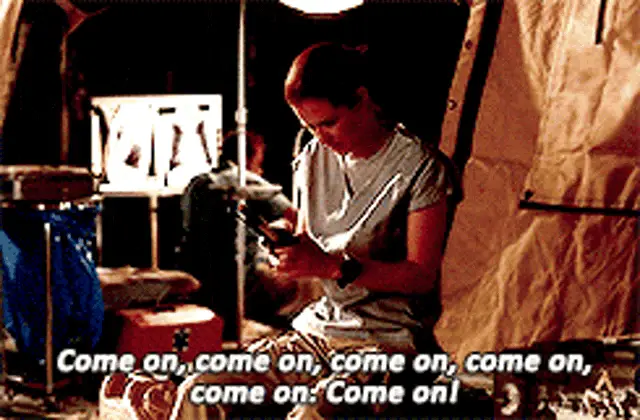Station19's Maya Bishop (Danielle Savre) in firefighter gear, with a fire truck in the background, saying 'Come On.'