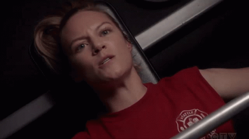 Maya Bishop (Danielle Savre) intensely lifting weights during a workout at the gym.