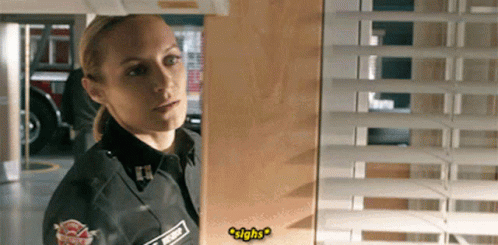 Maya Bishop (Danielle Savre) from Station 19 sighs while in her firefighter uniform, looking out a window.