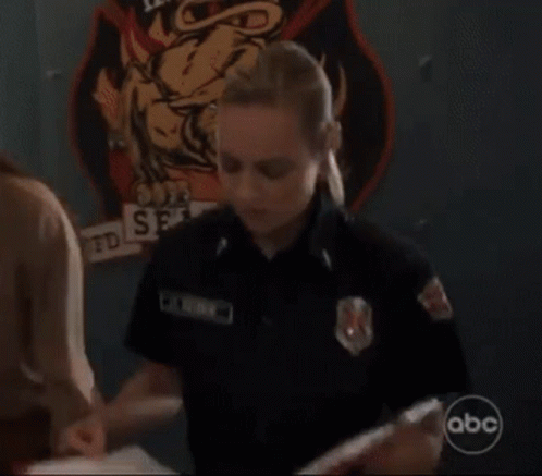 Maya Bishop (Danielle Savre) from Station 19 reviews a binder in her firefighter uniform.
