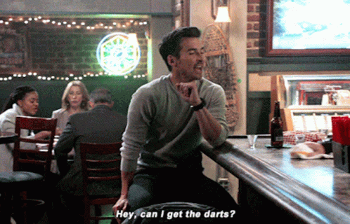Travis Montgomery (Jay Hayden) from Station19 sits at a bar and asks, 'Hey, can I get the darts?'