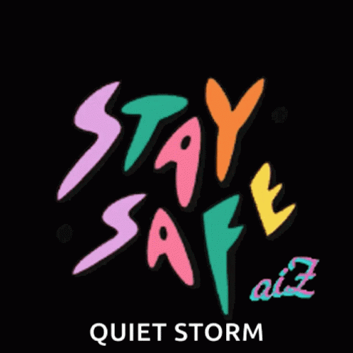 A vibrant graphic displays the message 'Stay Safe' in colorful, stylized letters, with 'aiZ' and 'QUIET STORM'.