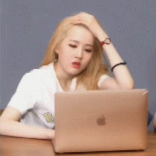 Stayc's Sieun looks tired and bored while sitting at a table with her Apple laptop.