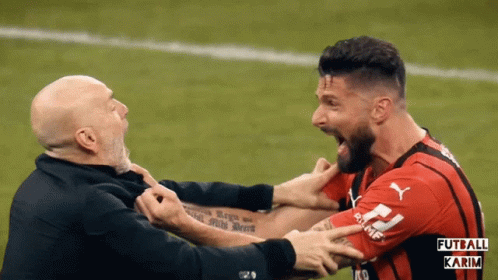 AC Milan coach Stefano Pioli and player Olivier Giroud share a joyful embrace and celebrate on the football field.