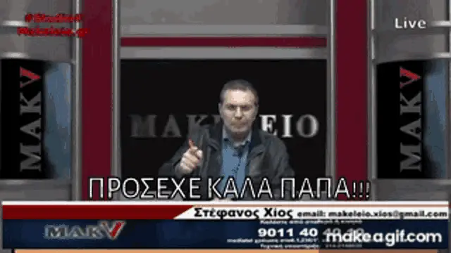 Stefanos Xios speaks in front of a screen with 'MAX VI' and 'Ante Gamisou' text displayed.