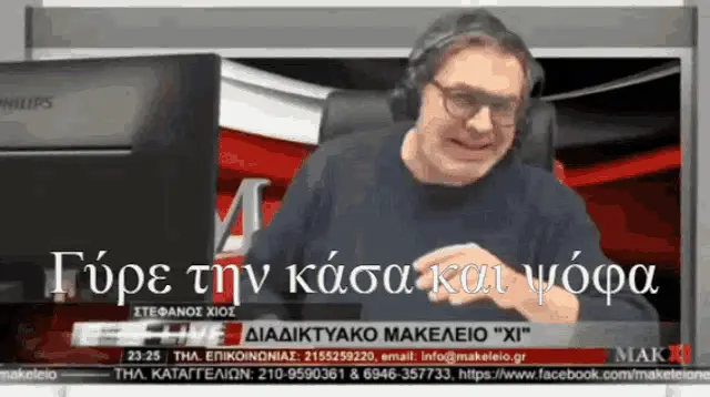 Greek TV personality Stefanos Chios points intensely at the camera, with a warning message 'Be very careful, Papa' appearing on screen.