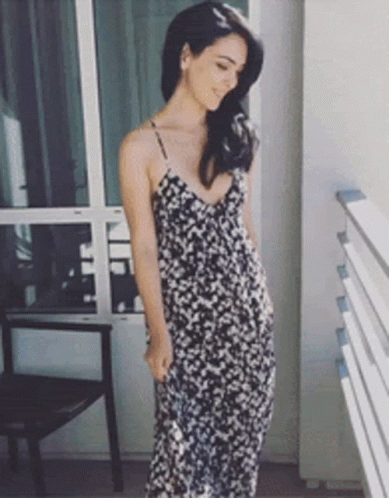 A woman in a black and white patterned maxi dress smiles on a balcony, embodying a classic aesthetic.