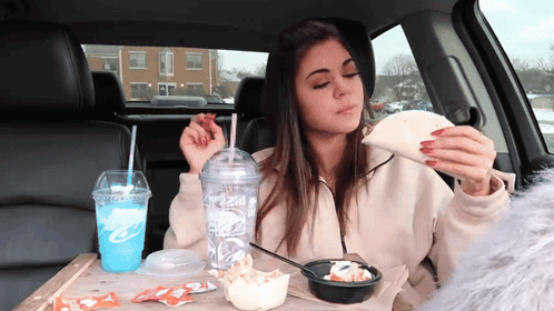 Steph Pappas enjoys a Taco Bell meal, including a chipotle cheddar double stacked taco, while sitting in her car.