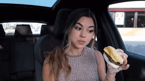 Steph Pappas enjoys a Wendy's breakfast sandwich while sitting in her car, taking bites of the meal.