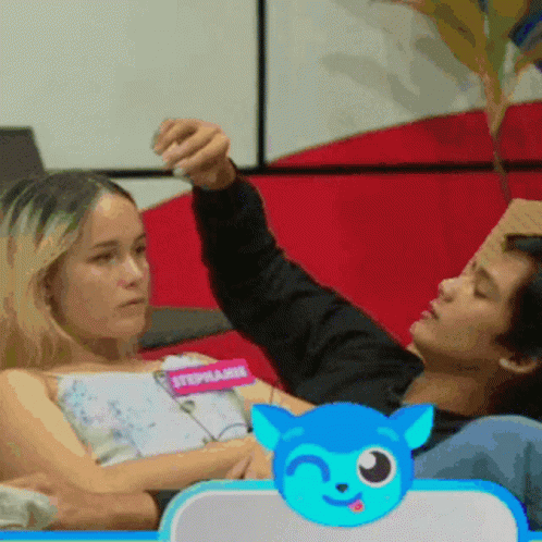 Stephanie Jordan and Dustine Mayores are seen relaxing on a couch, with Dustine gently touching Stephanie's hair.
