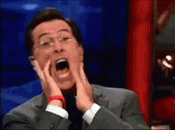 Stephen Colbert reacts with a shocked expression, holding his hands to his face with his mouth wide open.