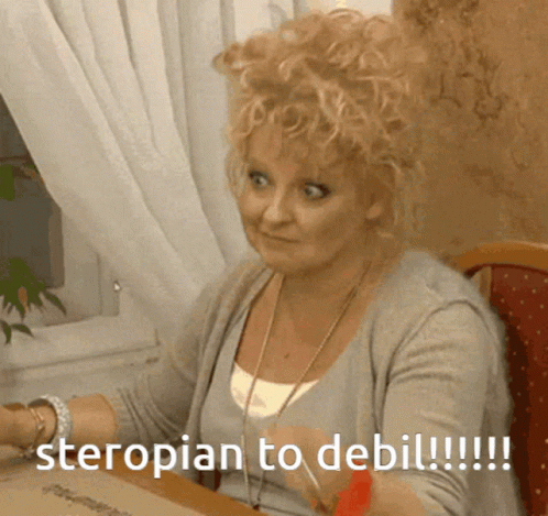 Woman with curly hair points, with text 'steropian to debil' visible, expressing strong disapproval.