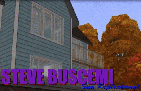 Steve Buscemi's face humorously replaces the sun in an animated sky over a house.