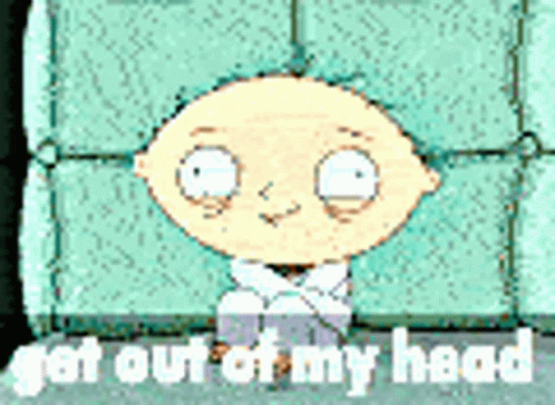 Stewie Griffin looking distressed with "get out of my head" text, followed by a woman saying "I'll heat up some lasagna".