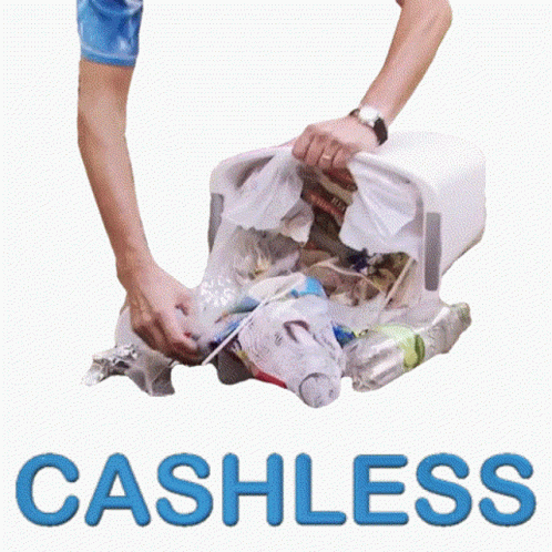 An animated clip showing hands putting trash into a bin, revealing the message 'Cashless Society'.