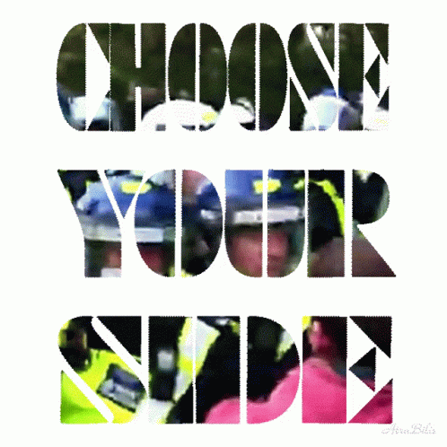 A dynamic collage featuring the text "CHOOSE YOUR SIDE" with images of police officers and individuals in pink attire.